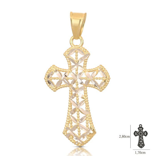 Prezzo di listino €129,00 EURPrezzo di listinoPrezzo unitario / perPrezzo scontato €129,00 EURCroce Traforata in Oro Giallo e Bianco 18kt